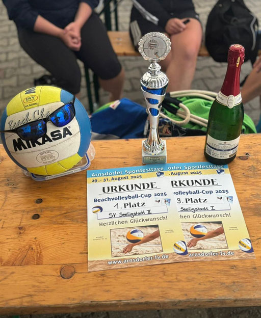 Unsere Volleyballer konnten dieses Wochenende beim Arnsdorfer Beachvolleyball-Cup groß aufspielen. Mit starkem Teamgeist und viel Einsatz erkämpften sie sich den 1. Platz sowie einen soliden 9. Platz im Teilnehmerfeld. Herzlichen Glückwunsch an unsere Mannschaften für diese tolle Leistung!